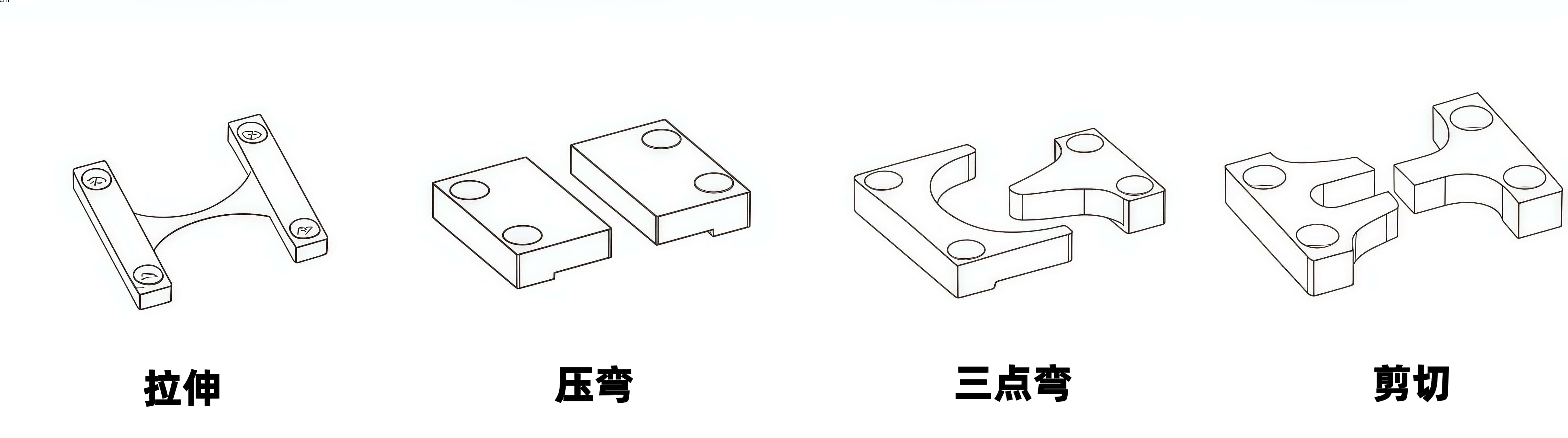 支持更换多种专用夹具,实现测试样品的拉伸、压缩、三点弯曲及剪切测试。 |